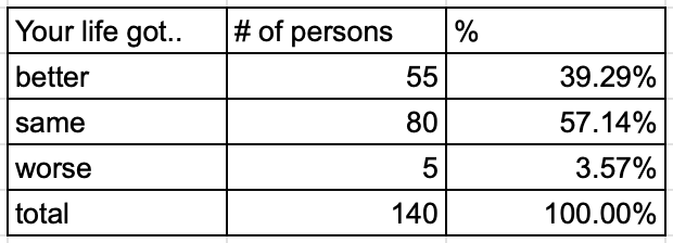 Second question: Those who feel your life stays the same as before, please stand up. [70-80 people, about 60%]
