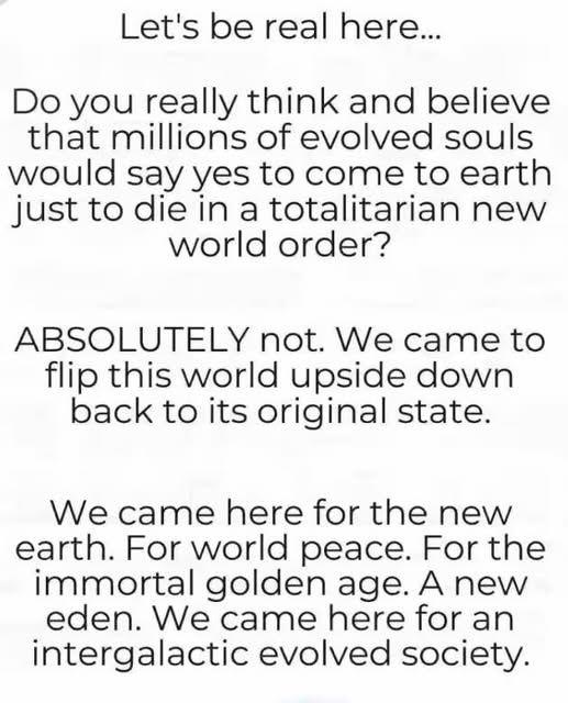 A képen: "Nézzünk szembe a valósággal... Tényleg azt gondolod és elhiszed, hogy milliónyi fejlett lélek igent mondana arra, hogy a Földre jöjjön, csak azért, hogy egy totalitárius új világrendben haljon meg? ABSZOLÚT nem. Azért jöttünk, hogy felforgassuk ezt a világot, és visszaállítsuk eredeti állapotába. Az új Földért jöttünk ide. A világbékéért. A halhatatlan aranykorért. Egy új Édenért. Egy intergalaktikus, fejlett társadalomért jöttünk ide."